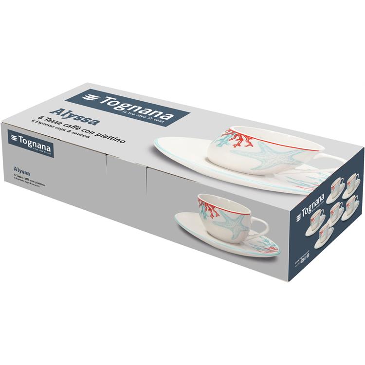 Le tazzine da caffè Alyssa della linea Metropolis dalle decorazioni marine sulle tonalità del rosso e dell'azzurro, porterà aria d'estate nella tua tavola. Ideale per una casa al mare, può essere utilizzata per una pausa di relax, la sera o per un dolce risveglio la mattina. Abbinabile con altri oggetti della stessa linea.