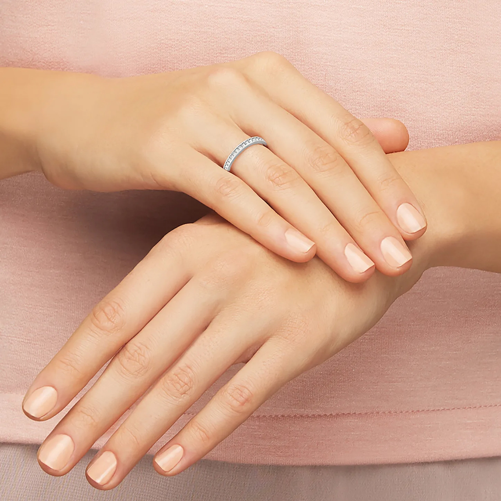 Il profilo di questo delicato anello rodiato ne sottolinea la raffinatezza e la vestibilità.