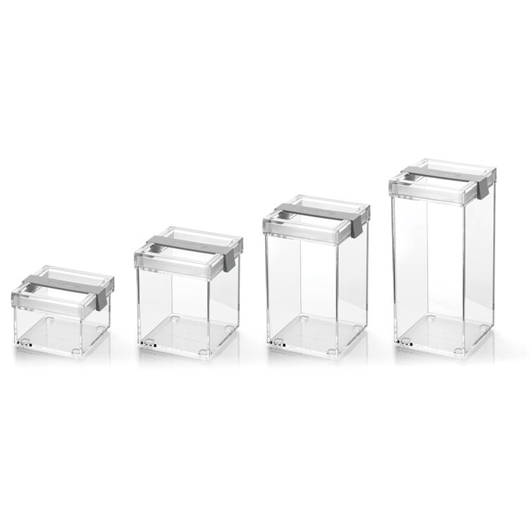 Barattolo dalla forma quadrata in materiale acrilico trasparente. Anche il coperchio, ermetico e salvafreschezza grazie ad una robusta guarnizione, è trasparente permettendo cosi d'identificare il contenuto del barattolo anche dall'alto. E proprio sul coperchio è posizionata una fascia bianco che funge da maniglia e facilita la trasportabilità del barattolo anche quando è pieno e ne agevola l'apertura e la chiusura con una sola mano.