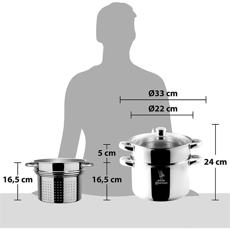 Pastaiola pastarella La Divina interamente in acciaio inox 18/10 a finitura lucida. Il fondo leggero favorisce l'ebollizione rapida dell'acqua per un risparmio energetico.