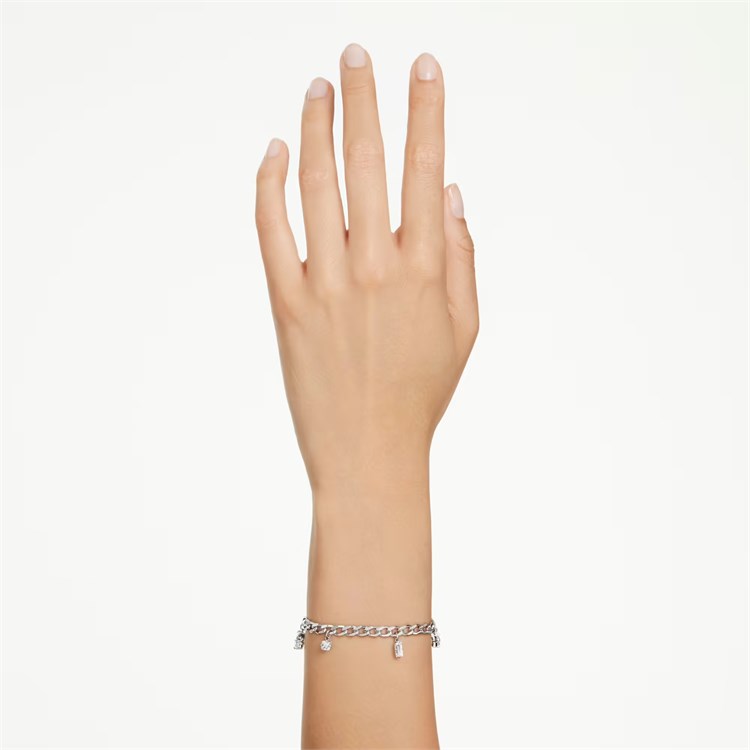 Bracciale placcato in rodio con 5 ciondoli in cristallo con taglio zirconia di diversi modelli, montati a griffe per meglio catturare la luce e brillare al tuo polso.