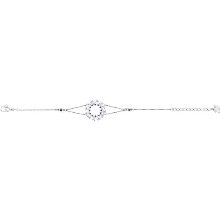 Lo straordinario design a catena rodiata su cui è inserito un elemento centrale circolare reso luminoso dal Clear Crystal con taglio a baguette e note di blu.