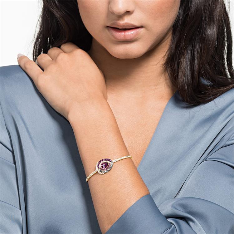 Combinando l'eleganza vintage con il fresco splendore, è impreziosito da cristalli chiari e viola, e il centro a forma di goccia presenta la raffinata tecnica pietra su pietra.