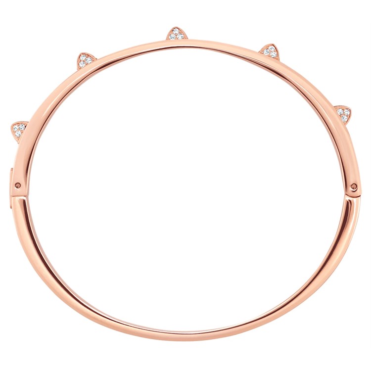 Il bracciale rigido in PVD oro rosa interpreta gli attualissimi trend di bracciali rigidi sottili e borchie.