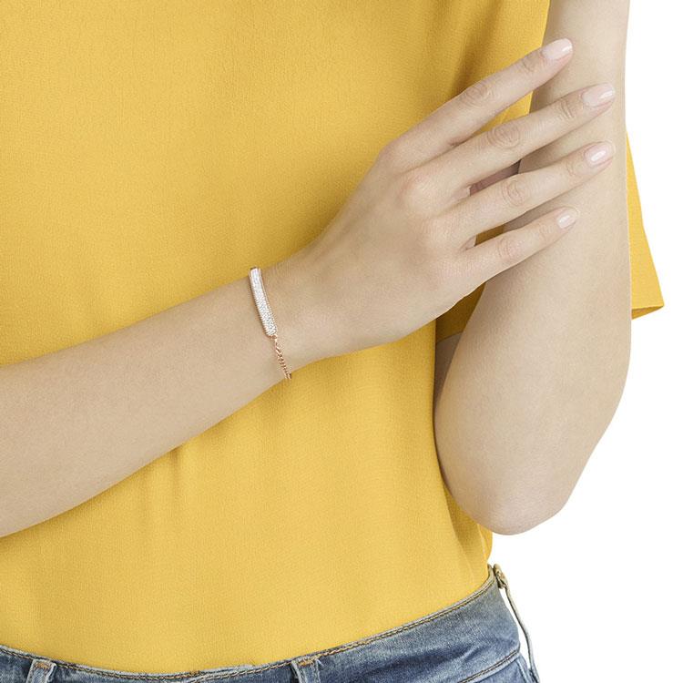 Look davvero glam con questo bracciale must- have con una trendy chiusura con barra a T, regolabile in tre diverse lunghezze. Con questo bracciale di aggiunge brillantezza e scintillio a qualsiasi outfit, il design placcato oro rosa presenta anche un pavè in Clear Crystal ed una mini catenina gourmette.