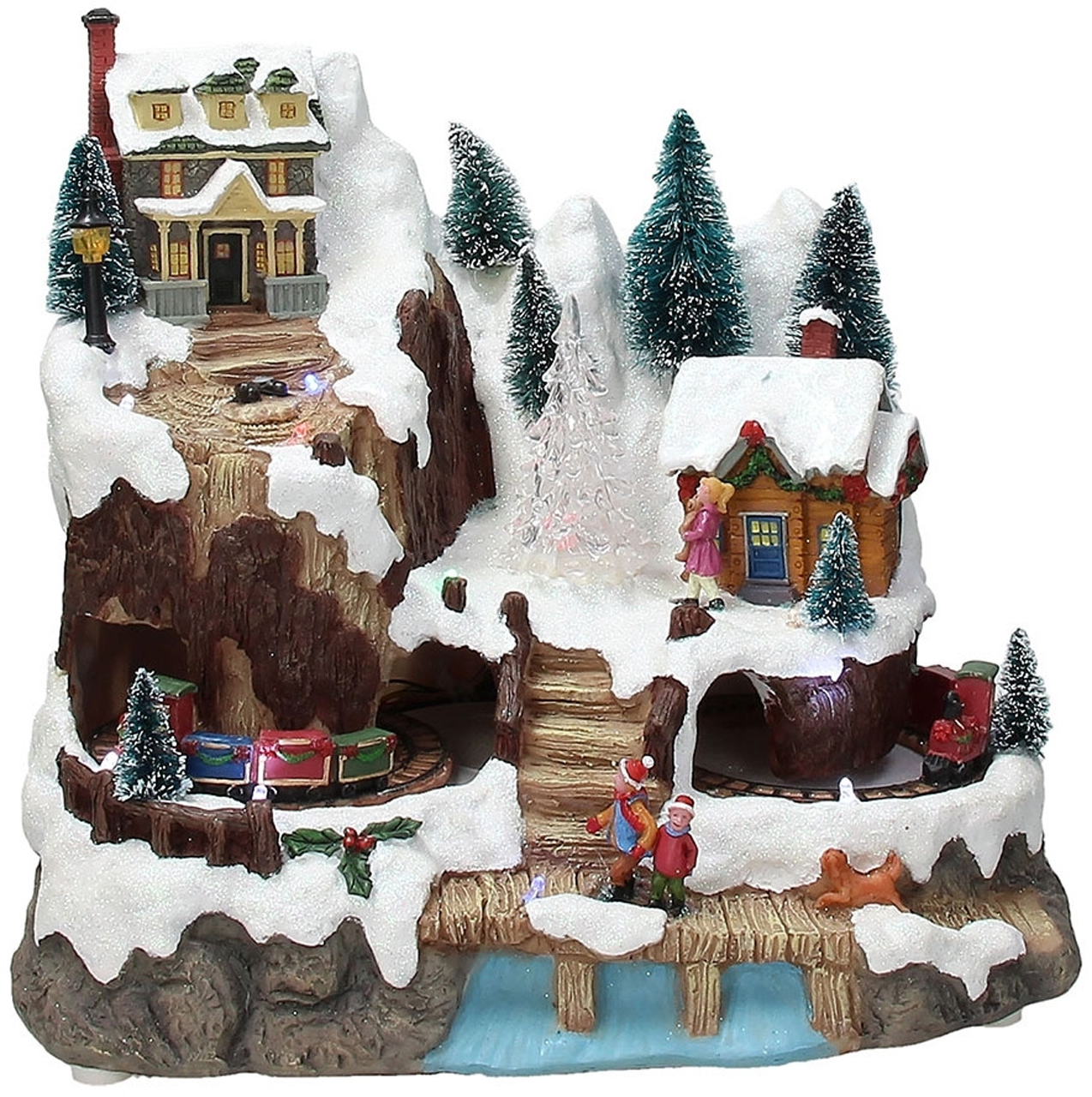 Un delizioso paesaggio montano illuminato da luci led. Una melodia natalizia accompagna il movimento dei due trenini. Una sicura attrazione per grandi e piccini