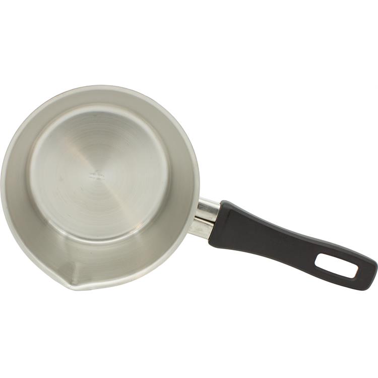 Mini casseruola in acciaio inox con manico lungo, di forma conica dotata di un beccuccio laterale comodo per versare. Adatta per cuore e scaldare. Manico lungo in bachelite, antiscottatura per una presa più sicura