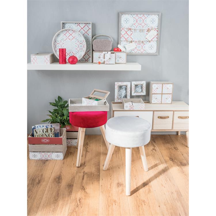 Cassettira realizzata in legno MDF con cassetti decorati nei colori del bianco, rosso e grigio