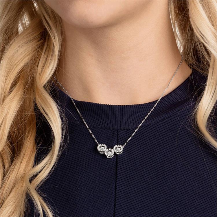 L'esclusiva tecnica Swarovski di sospendere la pietra centrale, "dancing crystal", presenta un tris di scintillanti cristalli fluttuanti all'interno di motivi circolari in pavè.