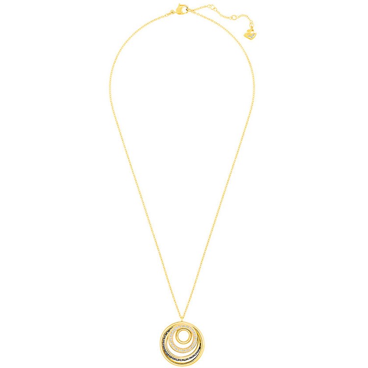 L'intrigante effetto a spirale del pendente è esaltato dal contrasto tra metallo placcato oro e cristalli scuri che alternano tagli squadrati e tondi.