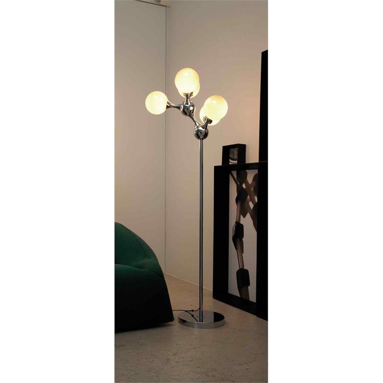 La struttura è in metallo cromato con sfere in vetro. Idonea per lampade con attacco E27