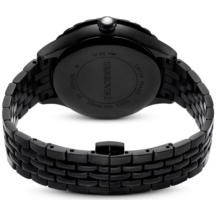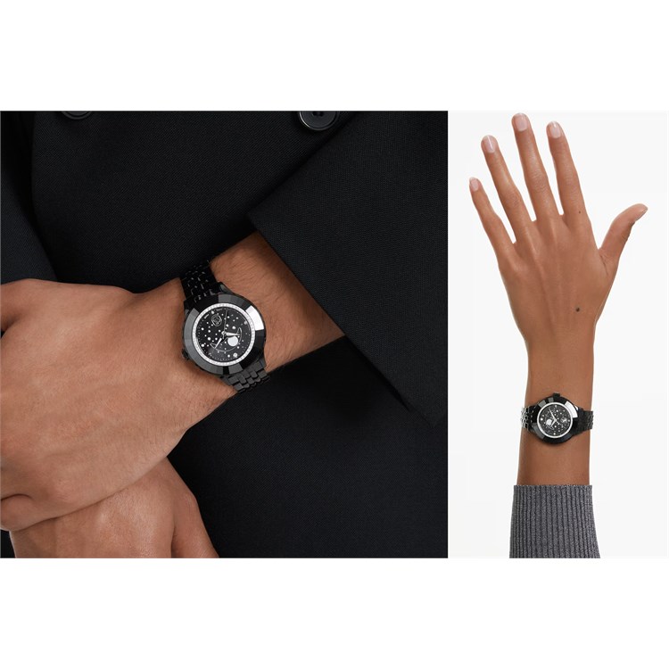 L'insieme della sua finitura in metallo nero, della lunetta sfaccettata in cristallo nero che contiene un anello di pavé di cristalli bianchi incastonati esaltano il quadrante, anch'esso nero, dov'è riprodotto il firmamento.