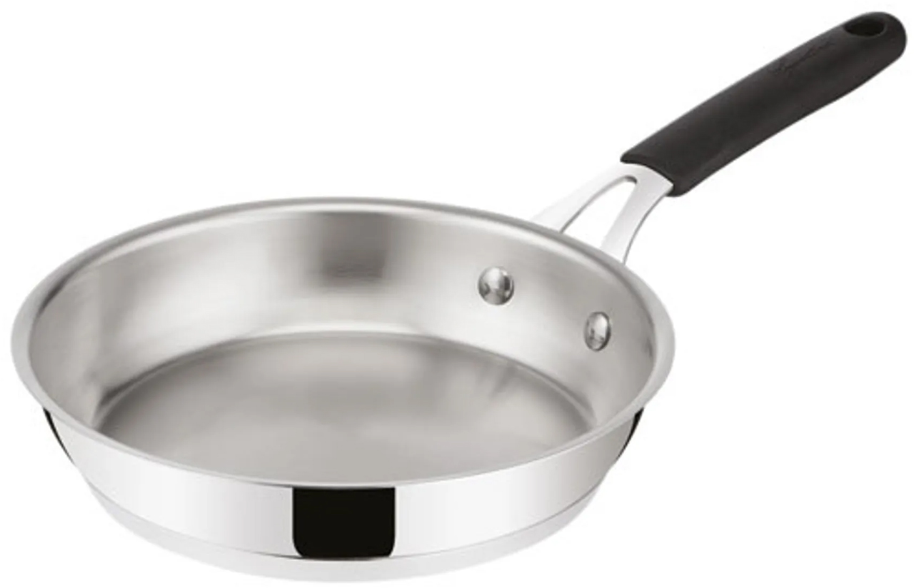 Linea di padelle Lagostina in acciaio inossidabile con un nuovo design nelle manicature ricoperte in silicone, antiscottatura e resistenti al forno fino a 210°C.
