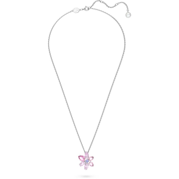 Un modello di pendente che non deve mancare in qualsiasi portagioie. Il pendente è realizzato con cristalli con diversi tagli e tonalità, dal rosa al viola, montati magistralmente a griffe che ne esalta la brillantezza.