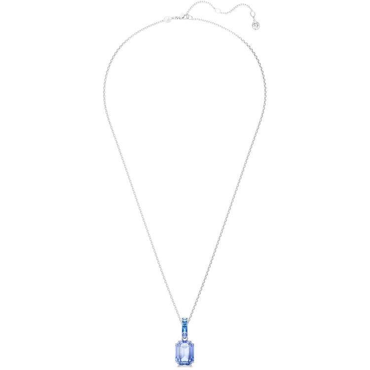 Per un tocco di vivacità e colore, il pendente Millenia, con i suoi toni azzurri blu ghiaccio del cristallo dal taglio ottagonale centrale Swarovski Re-Created, che è uno dei cristalli più sostenibili ad oggi, è montato su un passante con cristalli delle stesse sfumature azzurre, montati a binario.