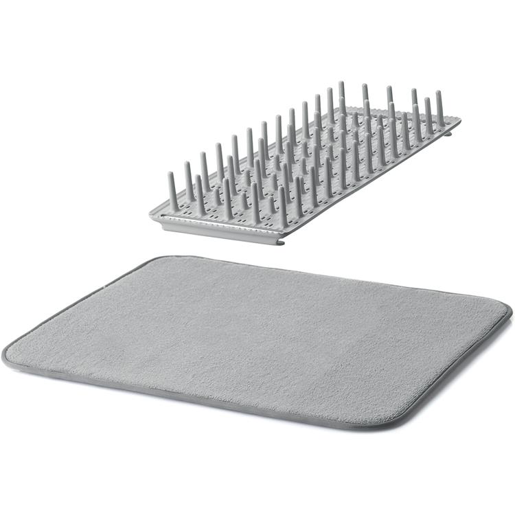 Versatile scolapiatti grigio opaco della linea Ecokitchen formato da un morbido tappetino in microfibra, materiale assorbente comodo per asciugare qualsiasi stoviglia, e una rastrelliera in plastica che si può spostare facilmente spostare come la si preferisce sopra al tappetino. Si può anche rimuovere