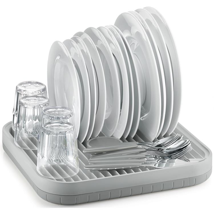 Flat&Drain di My Kitchen è lo scolapiatti/scolatutto utilizzabile ovunque grazie alla base raccogli acqua. Dalla forma discreta ma della massima capacità, è in grado di contenere fino a sei posti tavola completi. La particolare griglia consente di ancorare lo