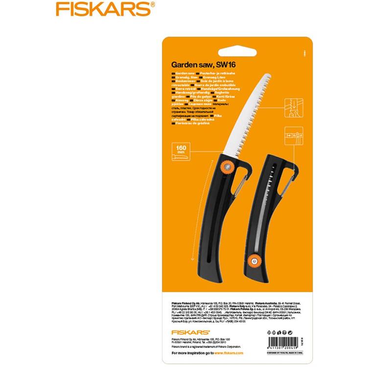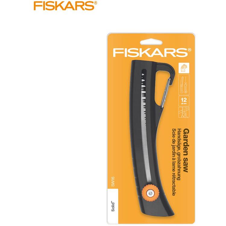 Sega da giardino Fiskars Solid SW16 per il taglio di steli e rami, facile da usare, con una dimensione ideale per il confort nella movimentazione e nel trasporto. E' dotata di un esclusivo meccanismo a scomparsa e di una clip per fissare la sega alla cintura rendendola facile da traspostare e riporre. Le lamiere in acciaio garantiscono una lunga durata e una grande nitidezza. I denti a doppia punta tagliano in entrambe le direzioni, per segare con la massima efficienza.