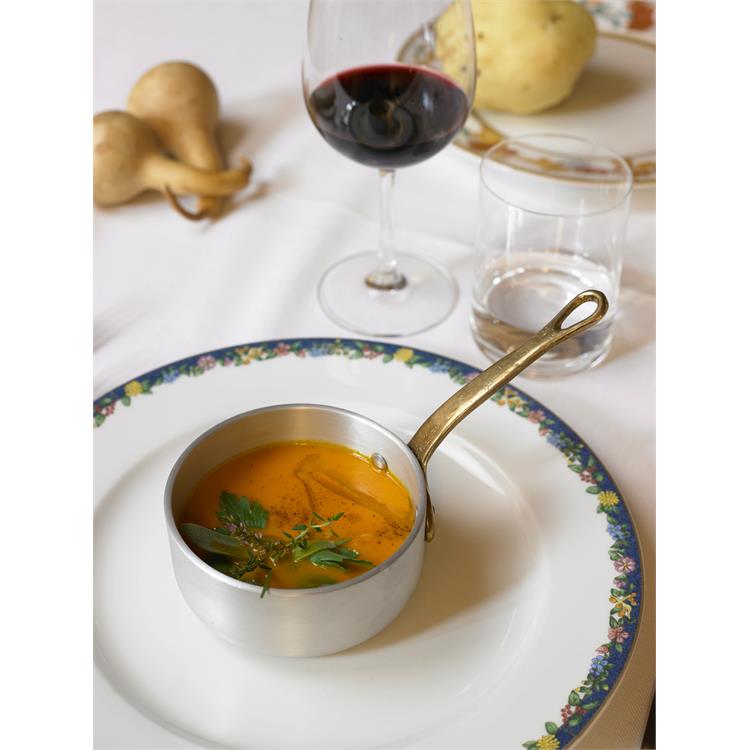 La casseruola a 2 maniglie in alluminio ad alto spessore con manicatura in ottone è rivestita internamente di antiaderente della migliore qualità.