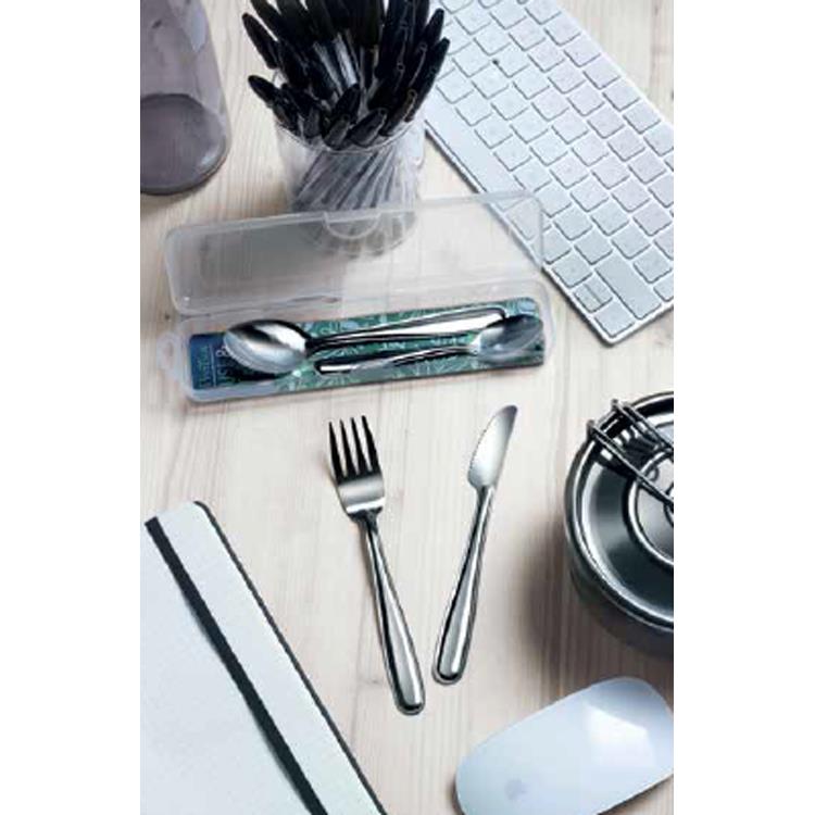 Il set da viaggio, utile per i pasti fuori casa, è completo di scatola custodia in polipropilene per contenere le posate e preservarle igienicamente.