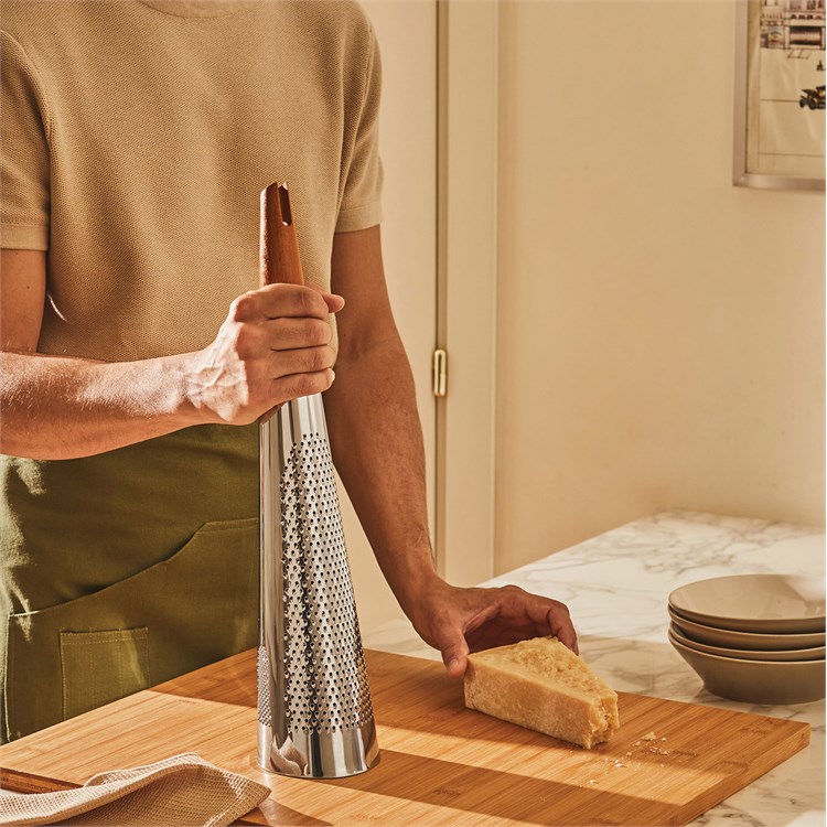 Grattugia gigante per formaggio e noce moscata in acciaio e legno. Dovete sapere che Sapper, uno dei designer con i quali lavoriamo da più lungo tempo, l’autore di alcuni dei nostri oggetti più innovativi, in casa sua ha il compito di grattugiare il formaggio per tutta la famiglia. Ispirato dunque da una lunga pratica personale sul tema, questa volta ha disegnato una novità che riempirà di soddisfazione i grandi consumatori di formaggio grattugiato. “Todo” consente infatti, grazie alla eccezionale corsa offerta dal lungo corpo troncoconico, di produrre con una sola passata la quantità di formaggio necessaria per ogni singolo piatto. Un eccellente esempio di oggetto da esibire sulla tavola o nella cucina, ma allo stesso tempo dotato di una precisa e innovativa prestazione funzionale che quasi trasfigura in gestualità ludica una delle operazioni cucinarie tra le più noiose e meno qualificanti.
