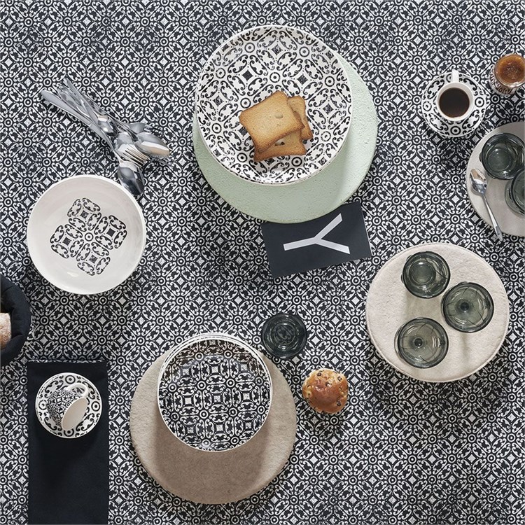 Il bianco e il nero, una tendenza sempre attuale, in questa linea vengono interpretati in modo grafico da pattern che ritroviamo dal tessile alla mise en place.