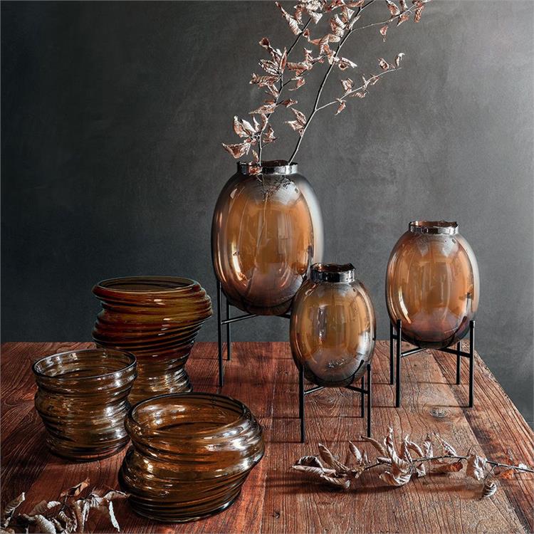 La collezione di vasi Calipso dalle tonalità ambra fa parte di una serie di vasi soffiati a bocca.