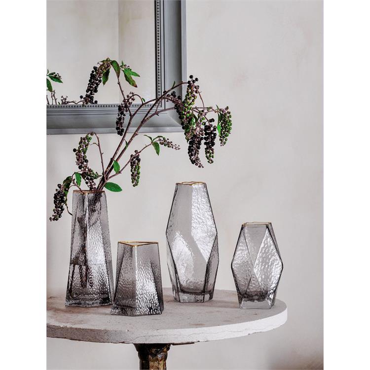 Vaso realizzato in vetro trasparente grigio con effetto martellato e bordo in oro zecchino lucido.