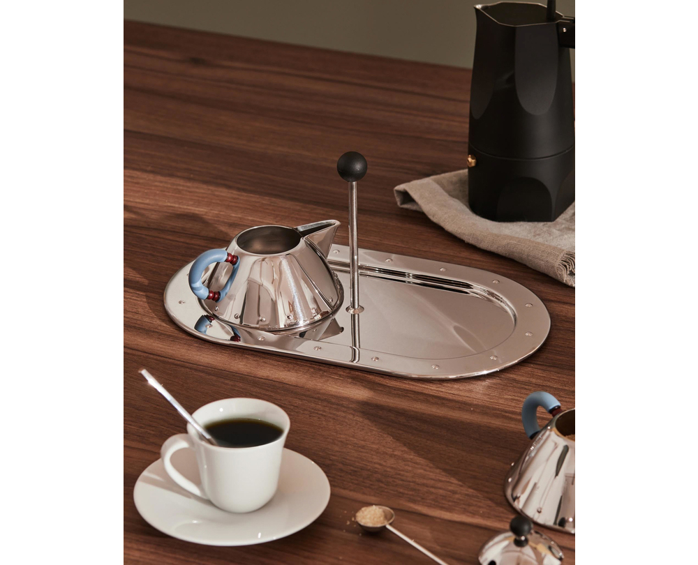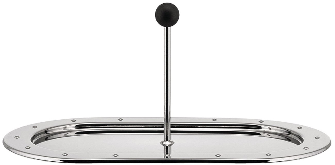 Vassoio in acciaio inossidabile 18/10 con pomolo in PA, studiato per contenere la zuccheriera 9097 e la cremiera 9096, elementi importanti della famiglia del bollitore con l’uccellino 9093, di cui riprendono l’elemento formale del tronco di cono, la bugnatura alla base e i caratteristici manici.